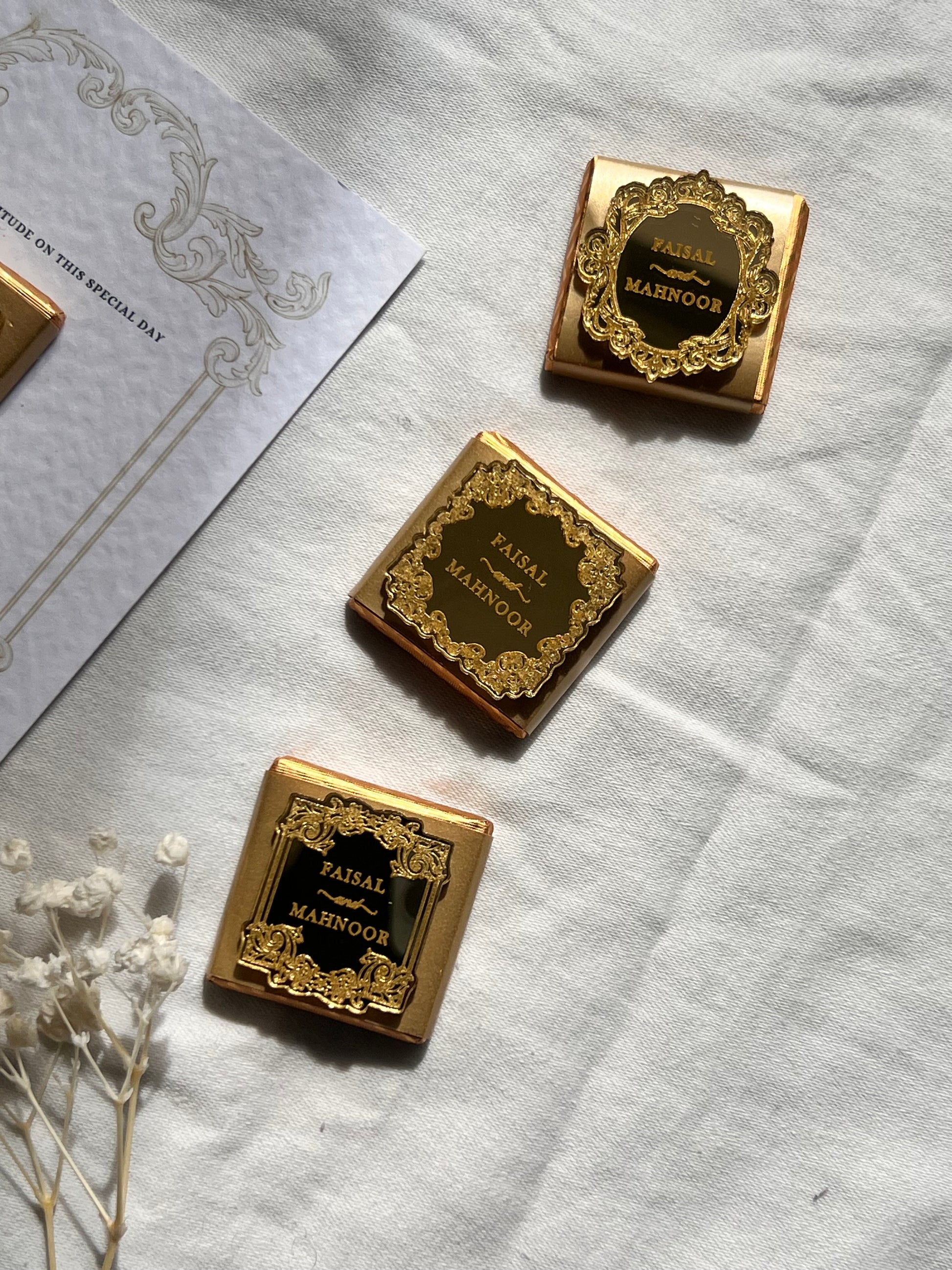 Our luxurious milk chocolates measure 35mm x 35mm and have 9–10 months of shelf life.